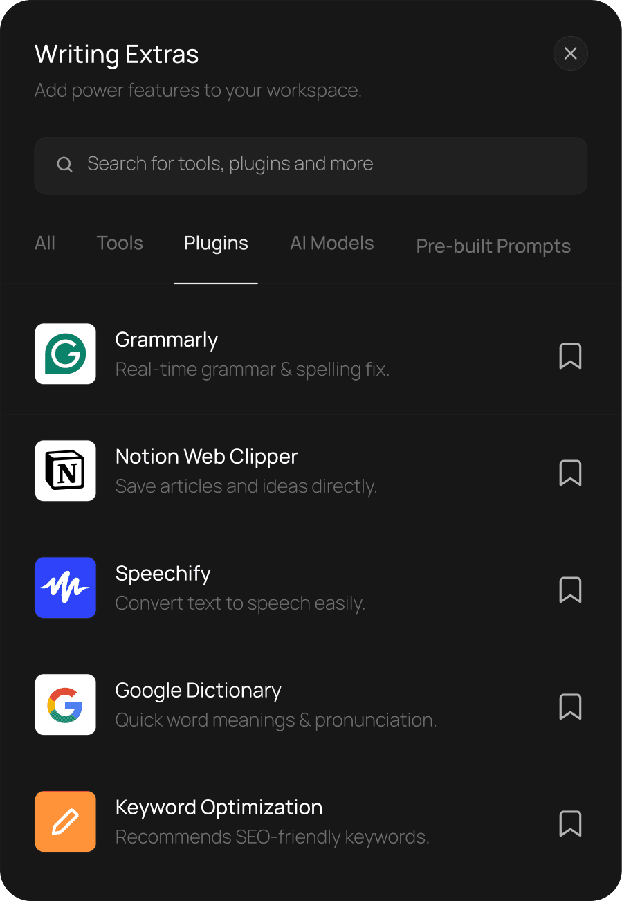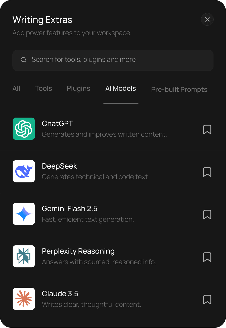 An integrated workspace brings plugins, AI models, smart tools, and prebuilt prompts together, streamlining every step of the teams workflow.